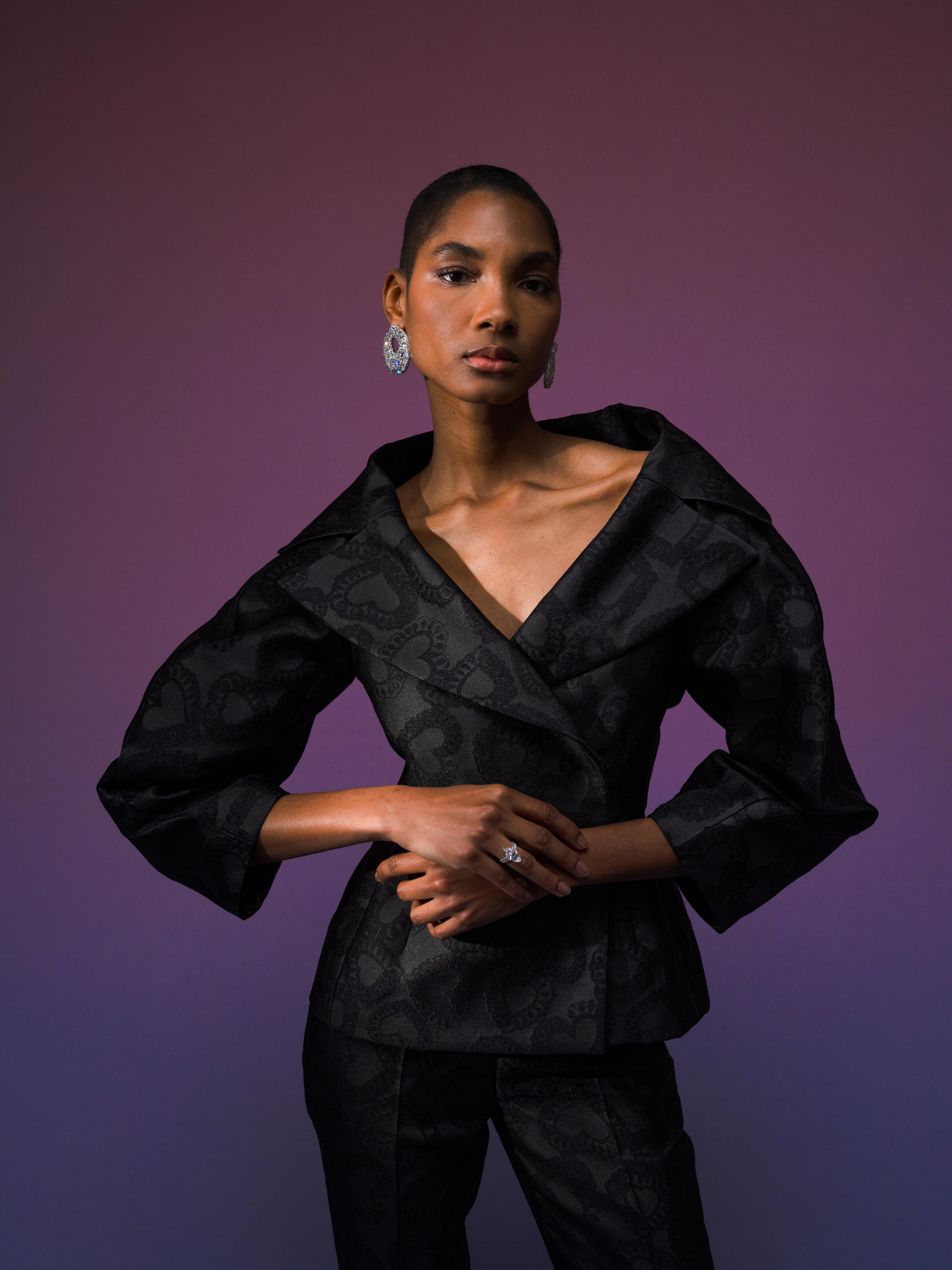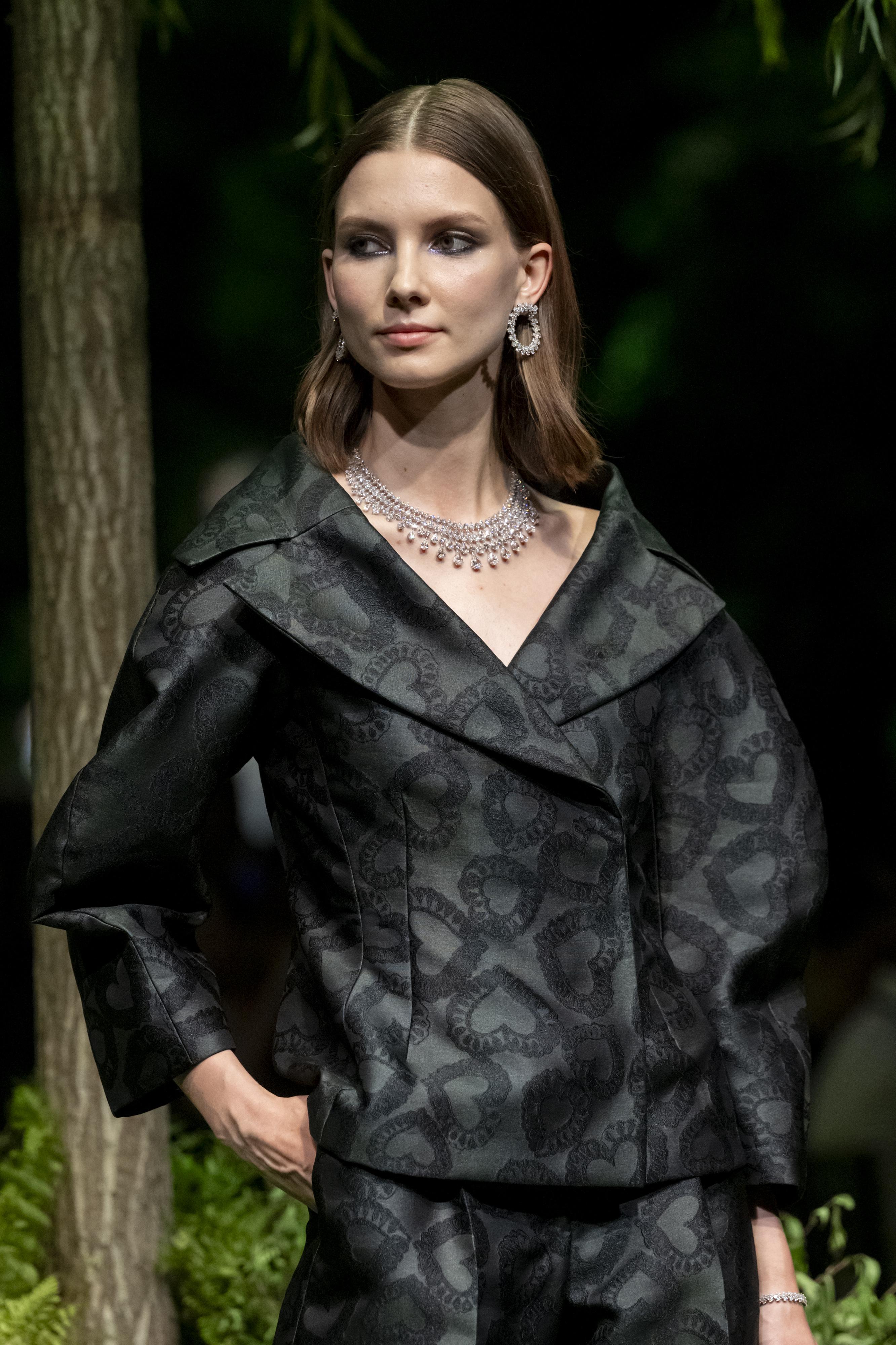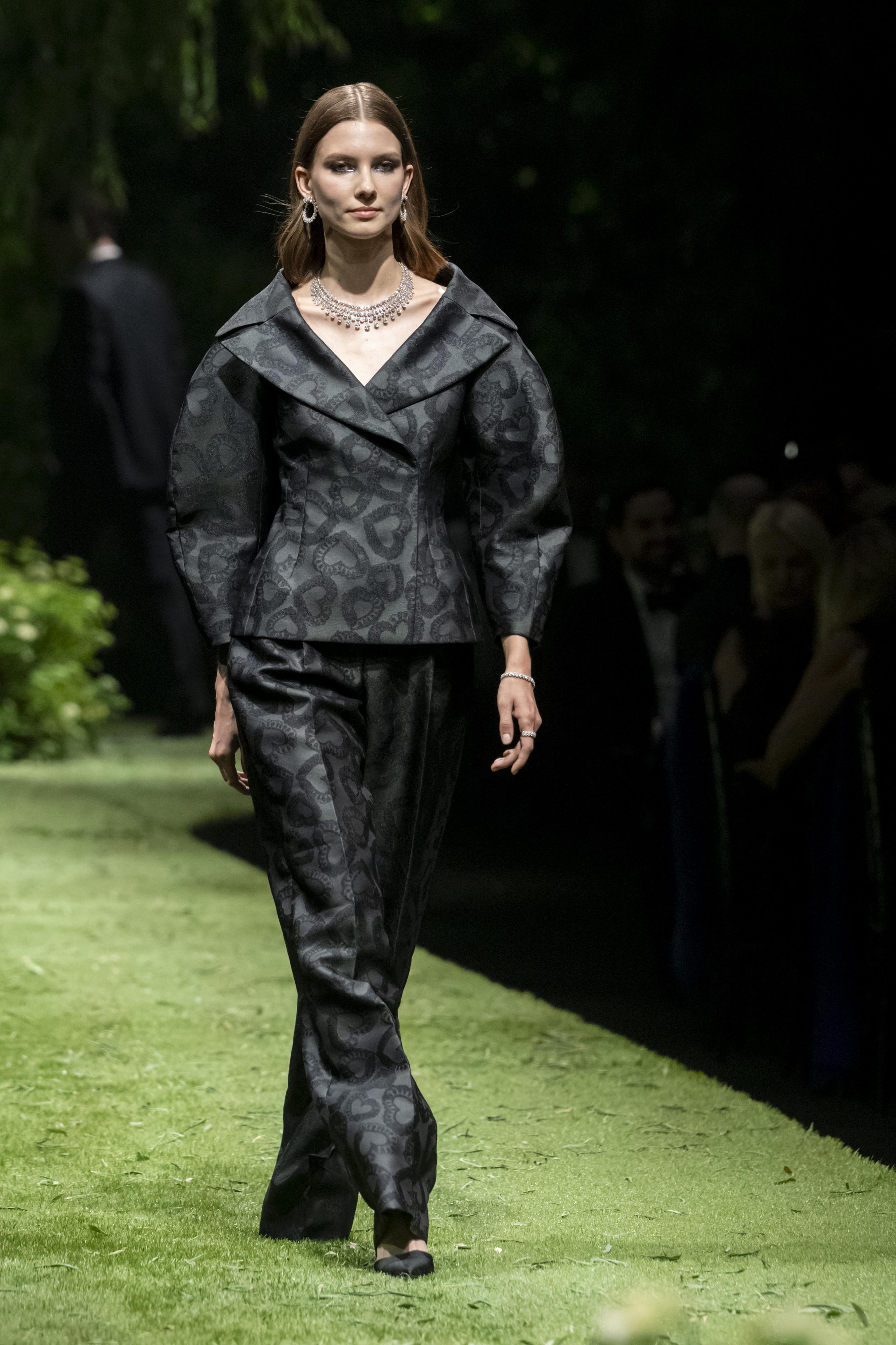 Sharply tailored evening tuxedo with large neckline and balloon sleeves in iconic 'Happy hearts' jacquard.