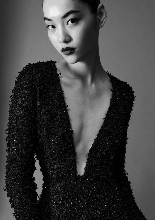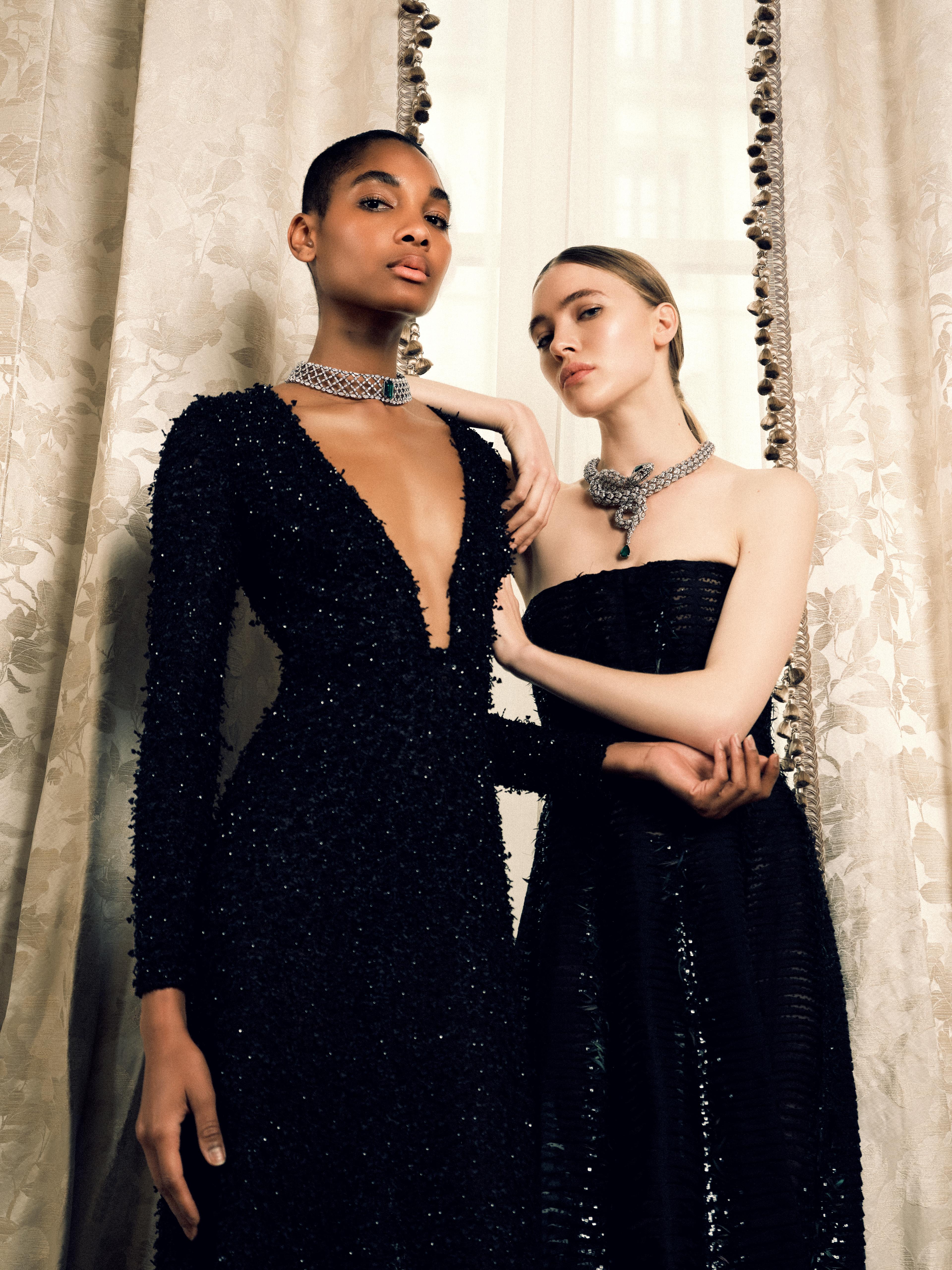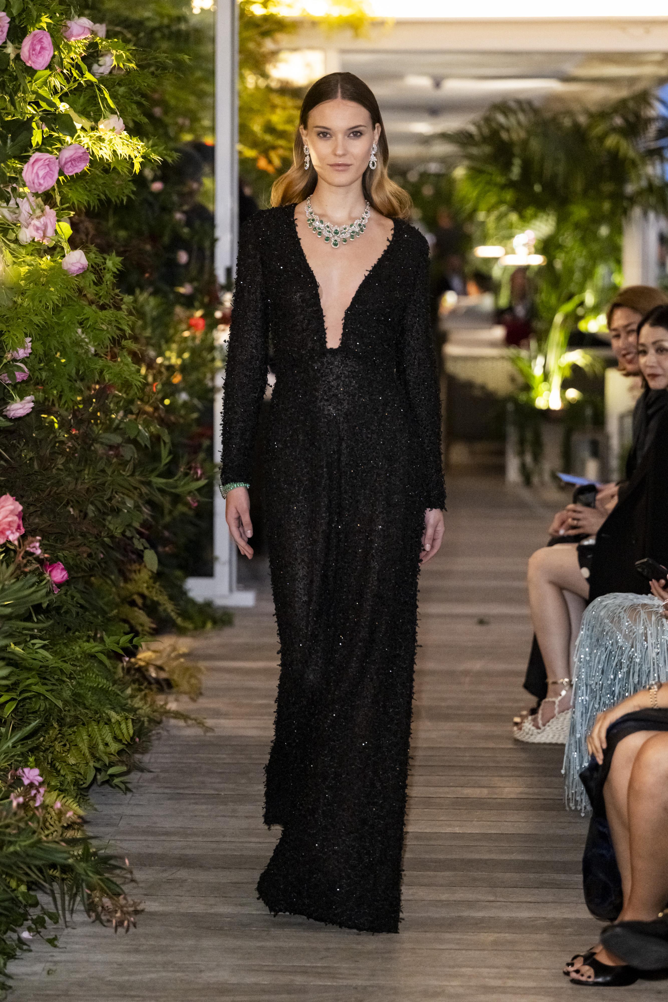 Contact usLong sleeved dress with deep V neck in black swiss iconic superposé heart embrdoiered silk mousseline fully handembroidered with black beads and crystals.