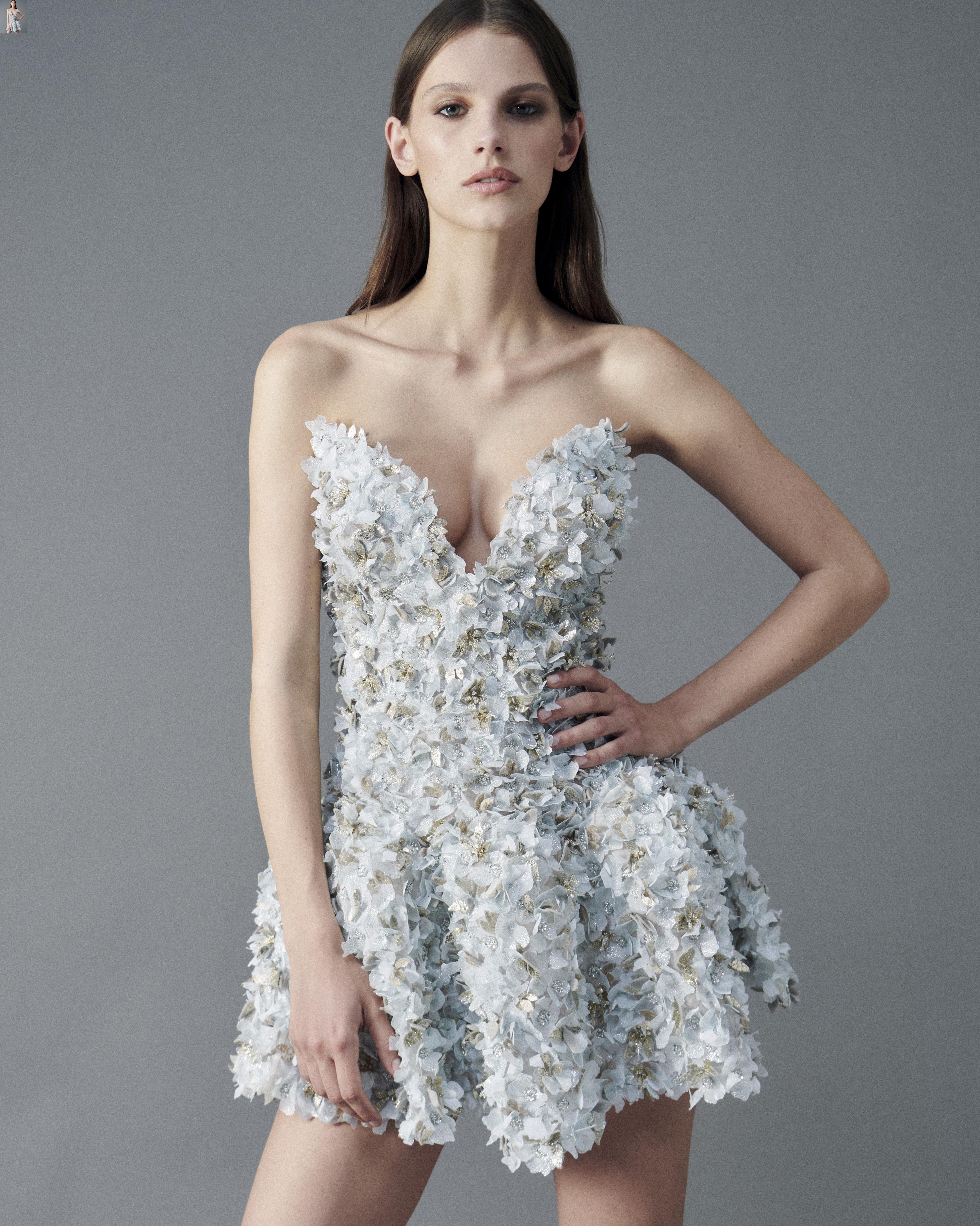 Contact usDeep V neck strapless dress in silk organza entirely decked out with silver, gold and pale aqua lace florals embroidered with sequins, crystals and beads.