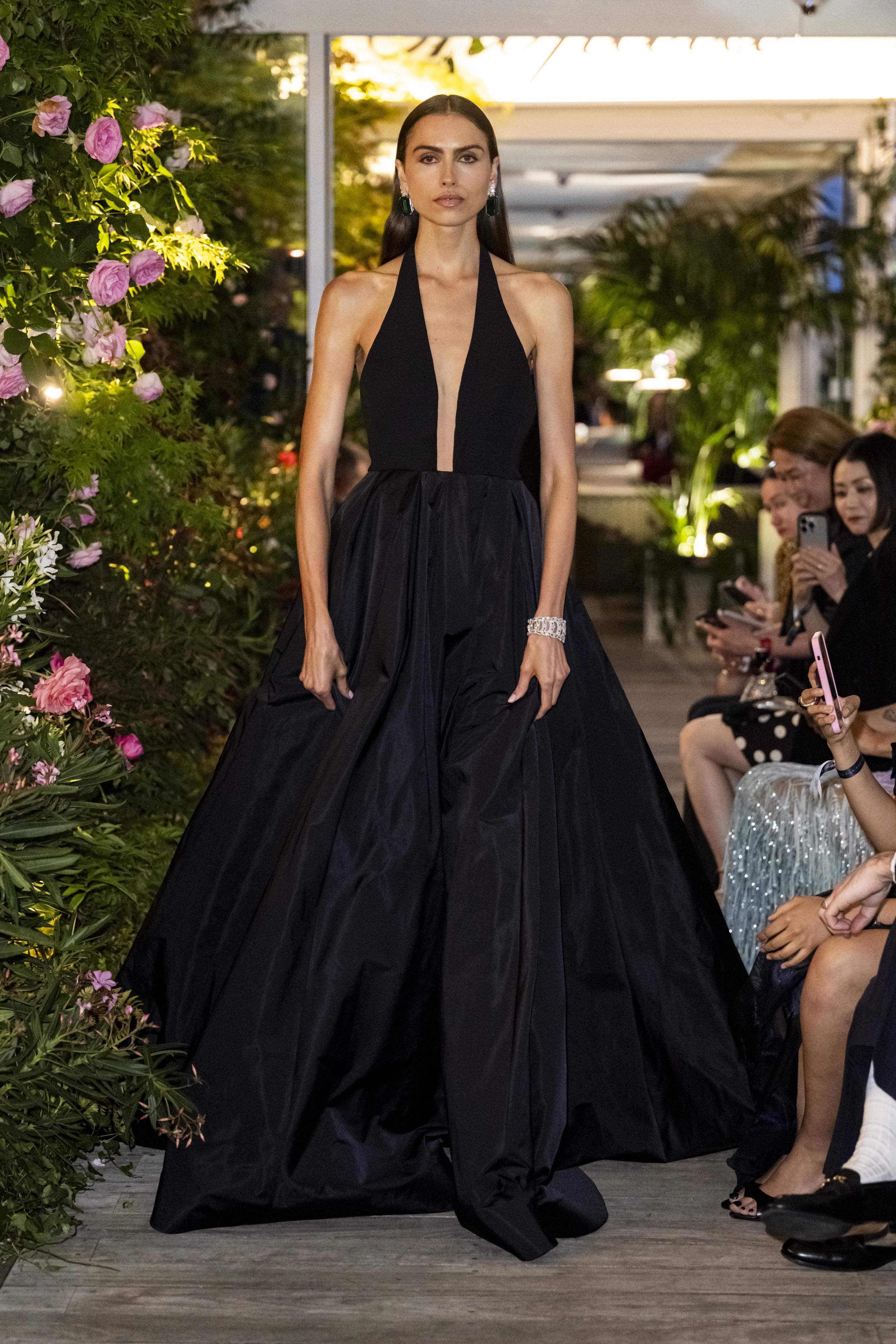 Contact usDramatic V shaped halter neck dress in black silk cady constructed on a body with very large black Silk Radzimir skirt lined in silk organza.