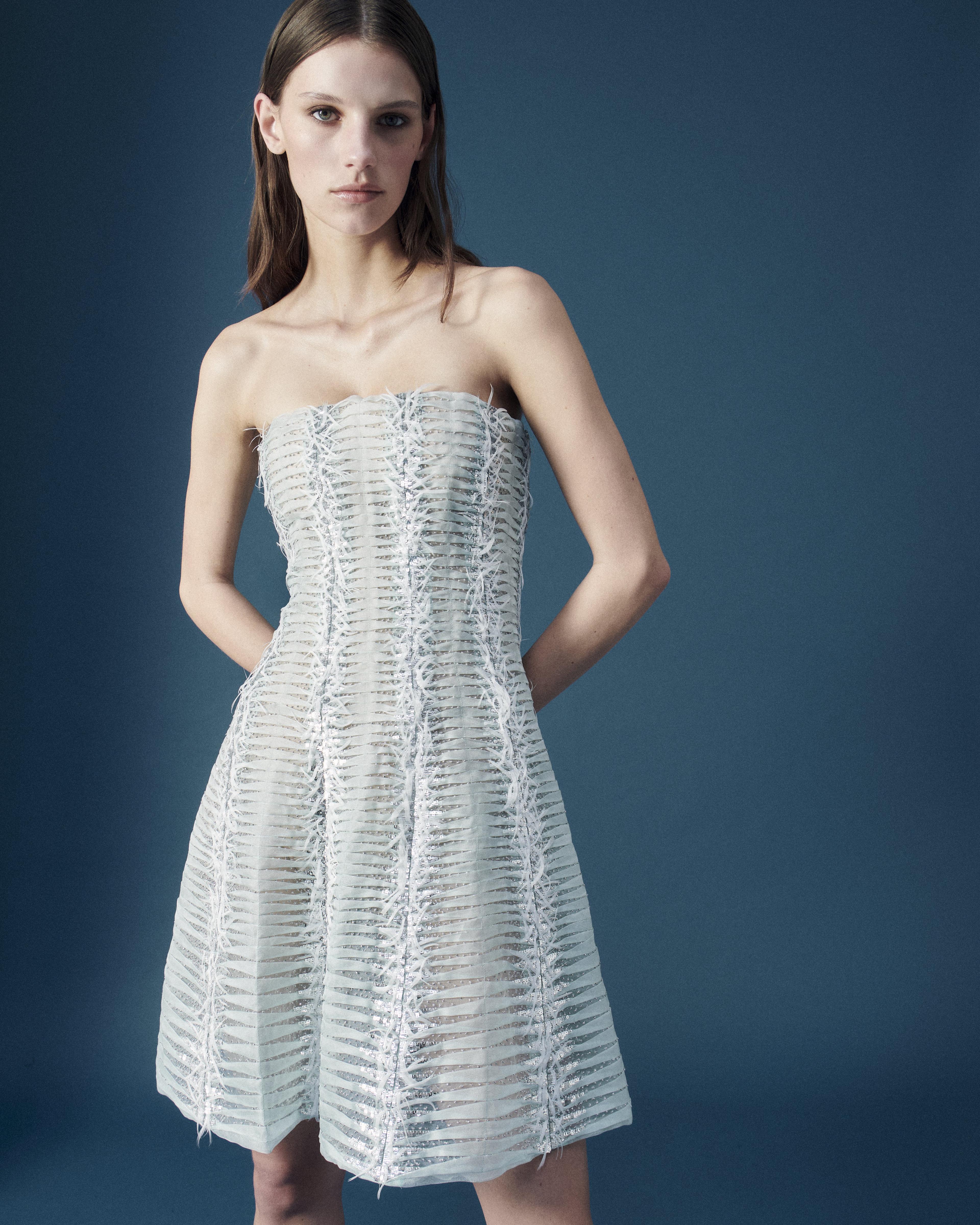 Pale aqua silk organza dress entirley decked out in an extraordinary technique of regular micro pleats embroidered with sequins, silver crystal beads and white feathers constructed on a corset with straight neckline.