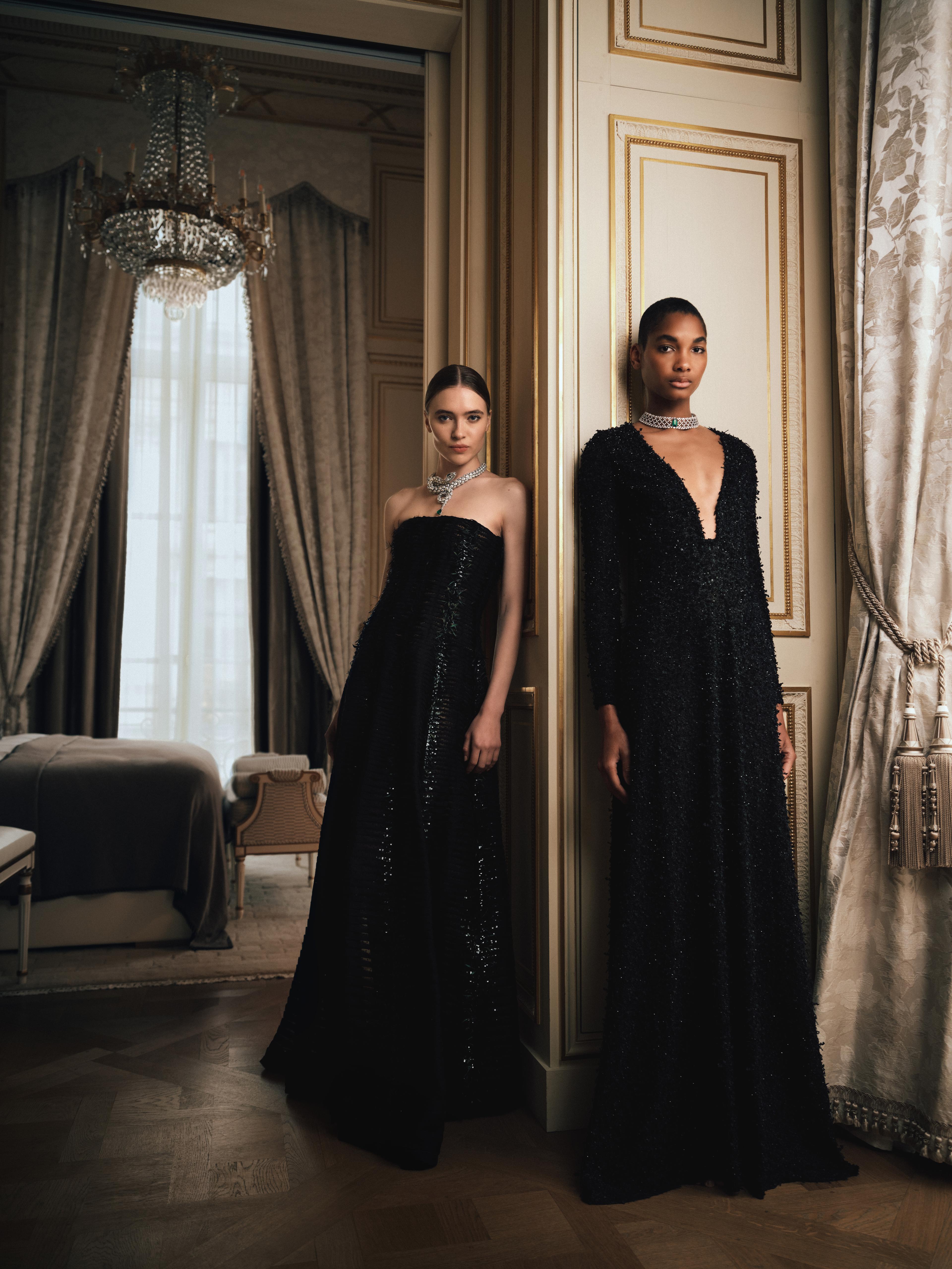 Contact usBlack silk organza dress entirley decked out in an extraordinary technique of regular micro pleats embroidered with sequins, black crystal beads and dark green iridescend feathers constructed on a corset with straight neckline.