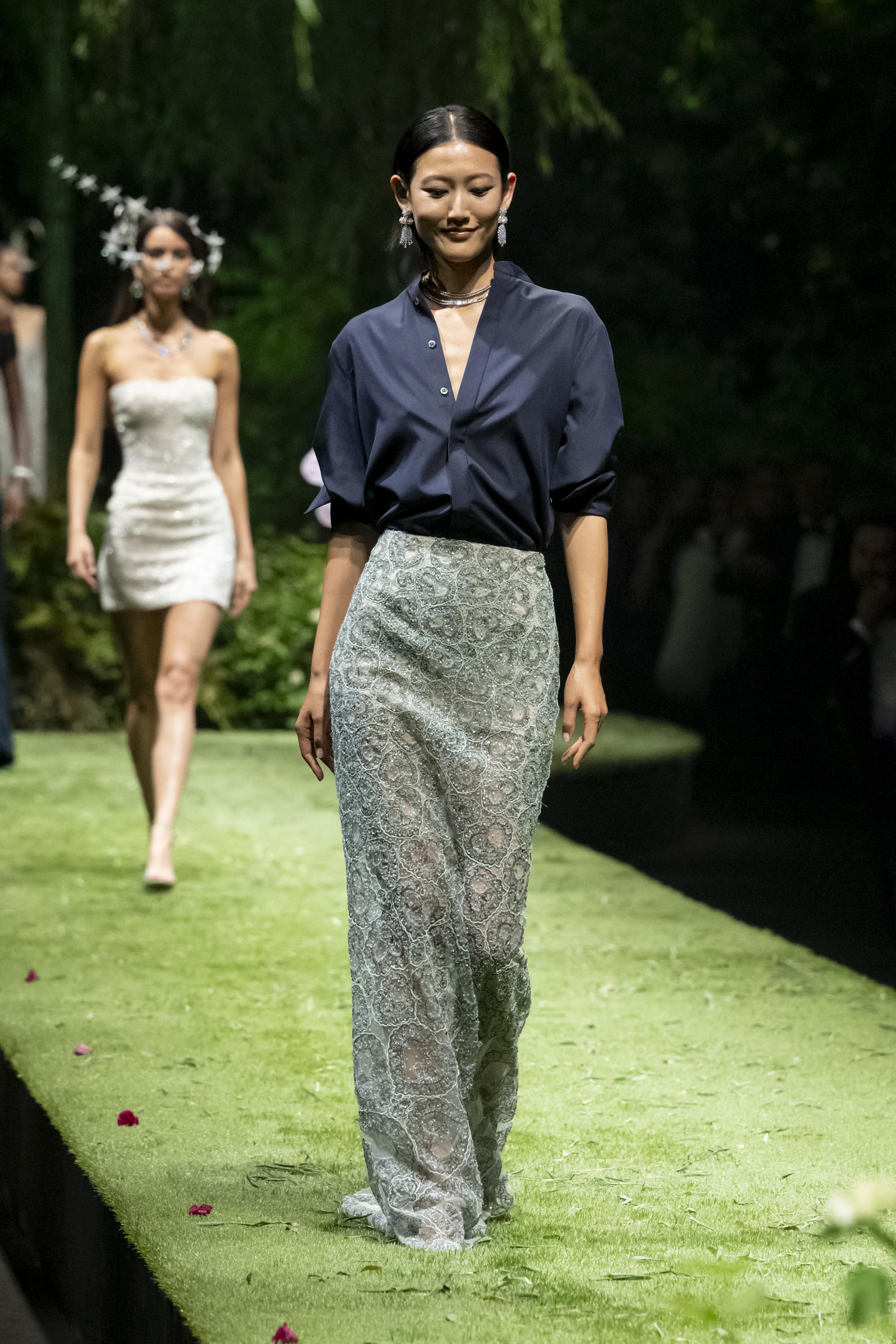 Contact usSiren skirt fully embroidered with Silk organza hearts entirely embrodiered with sequins, crystals and beads on a light tulle base with short silk georgette lining.