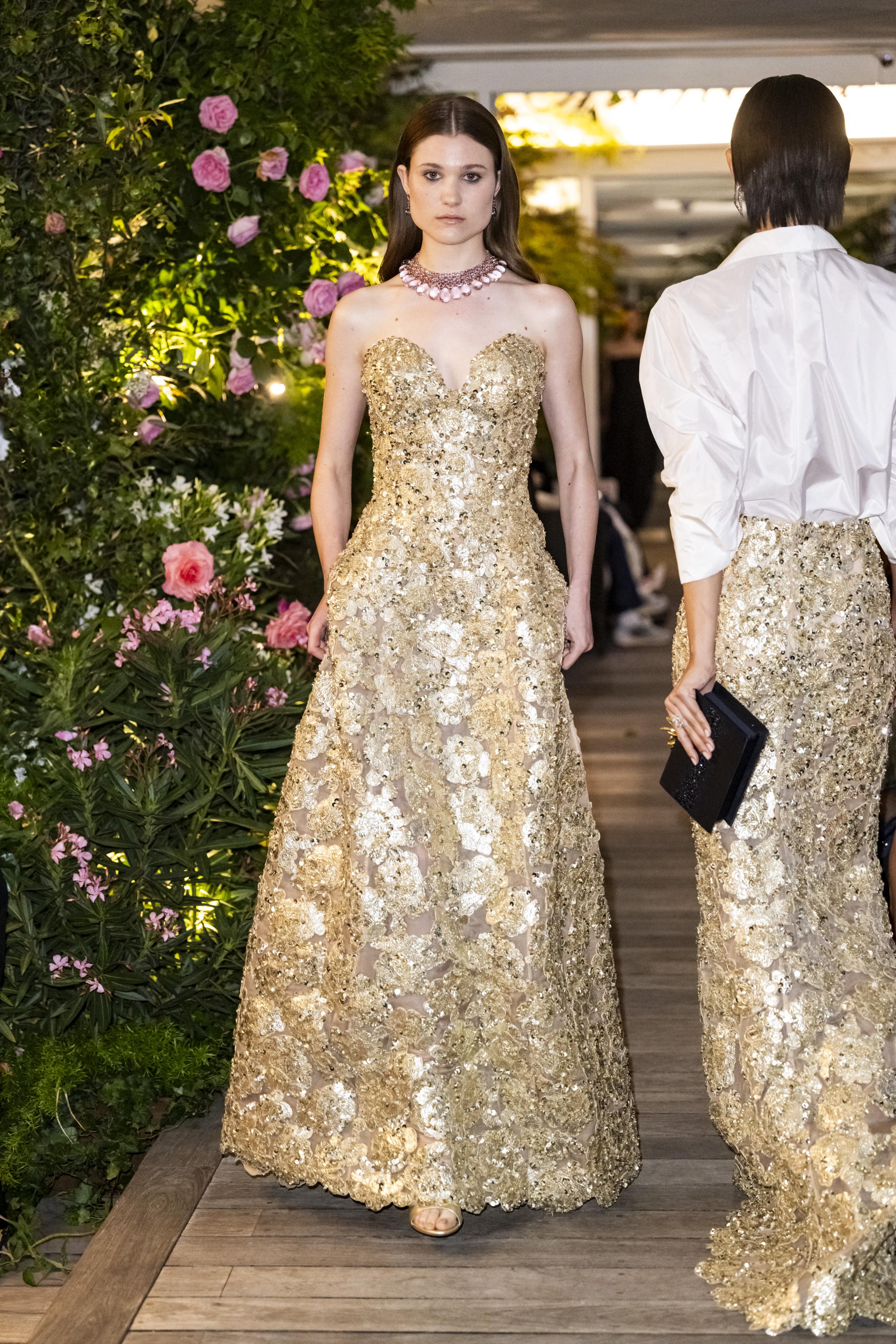 Contact usLong dress with heart shaped corset entirely decked out in golden swiss lace guipure elements embroidered with sequins, crystals and beads on a silk organza base.